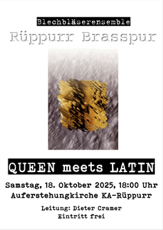 Unter dem Titel QUEEN MEETS LATIN präsentiert das Bläserensemble Rüppurr-Brasspur mit Bohemian Rhapsody, Innuendo und weiteren Ohrwürmern die bekanntesten Hits der Rockgruppe Queen. Das alles wird gemixt mit spätsommerlich-leichten Latin-Klängen u. a. von Chuck Mangione und Quincy Jones. Lassen Sie sich überraschen!